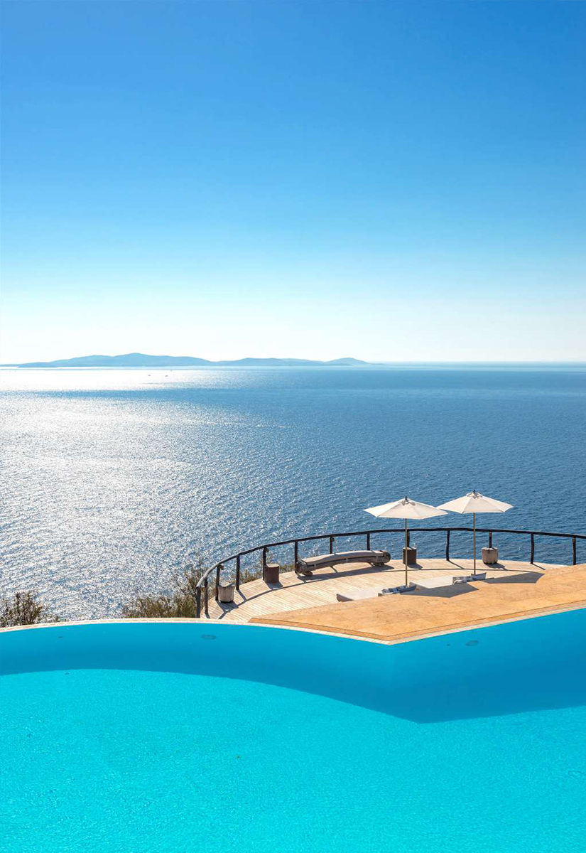 Spacious manicured private garden, with many private areas all enjoying spectacular views over the blue Aegean Sea, multi-function space with gym, massage room & steam room, jacuzzi