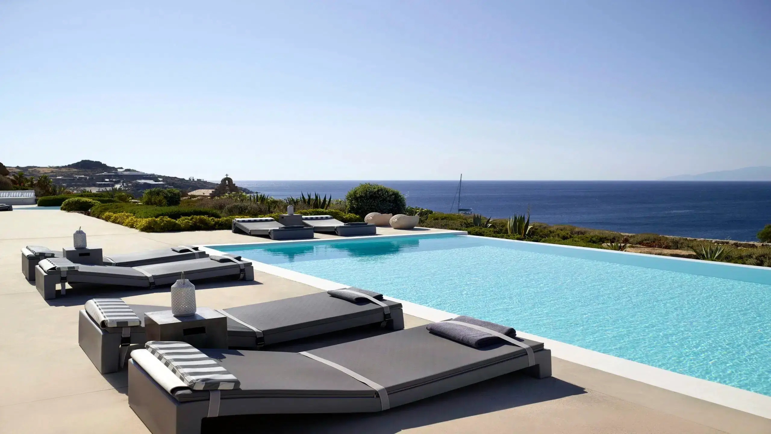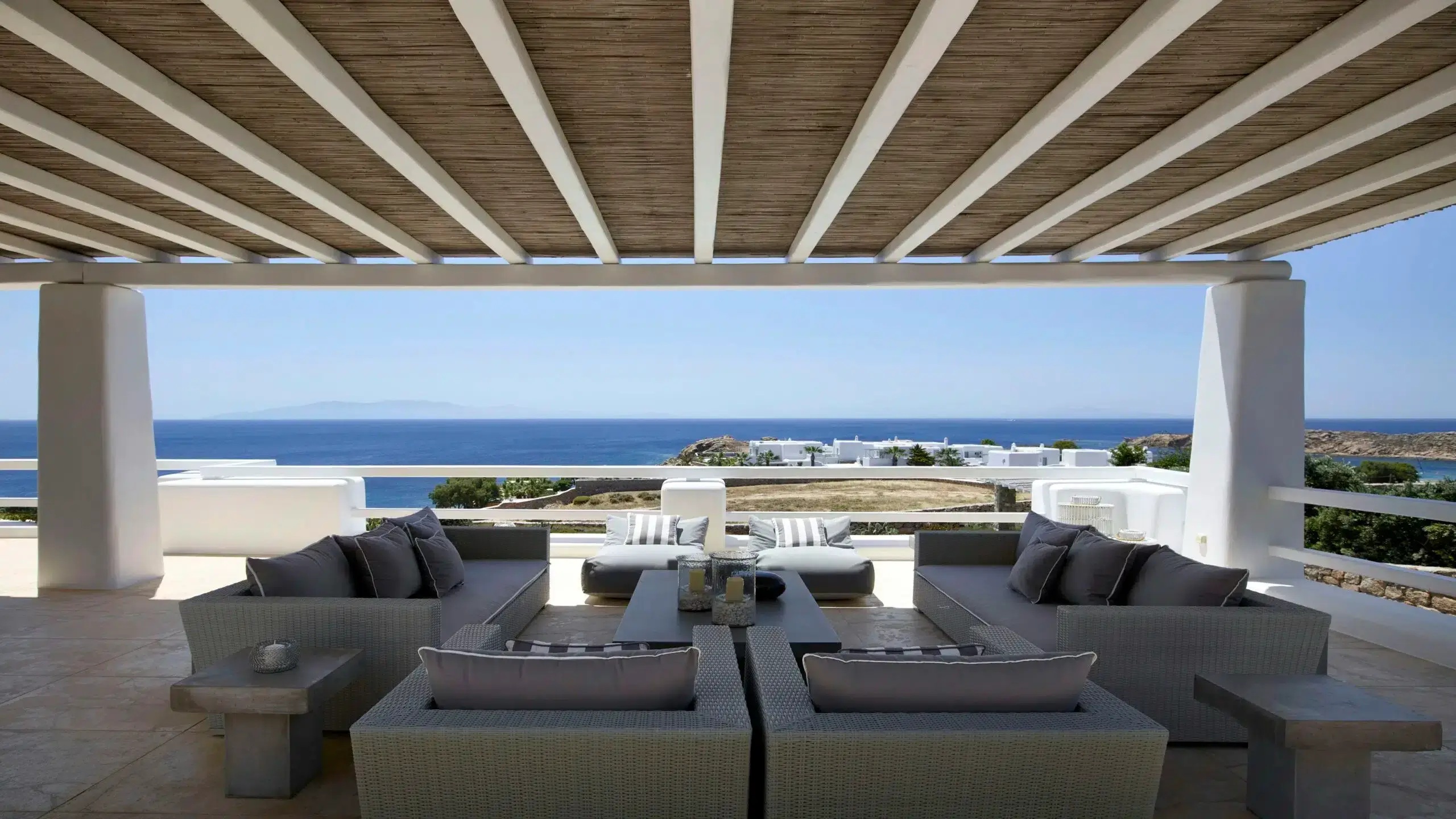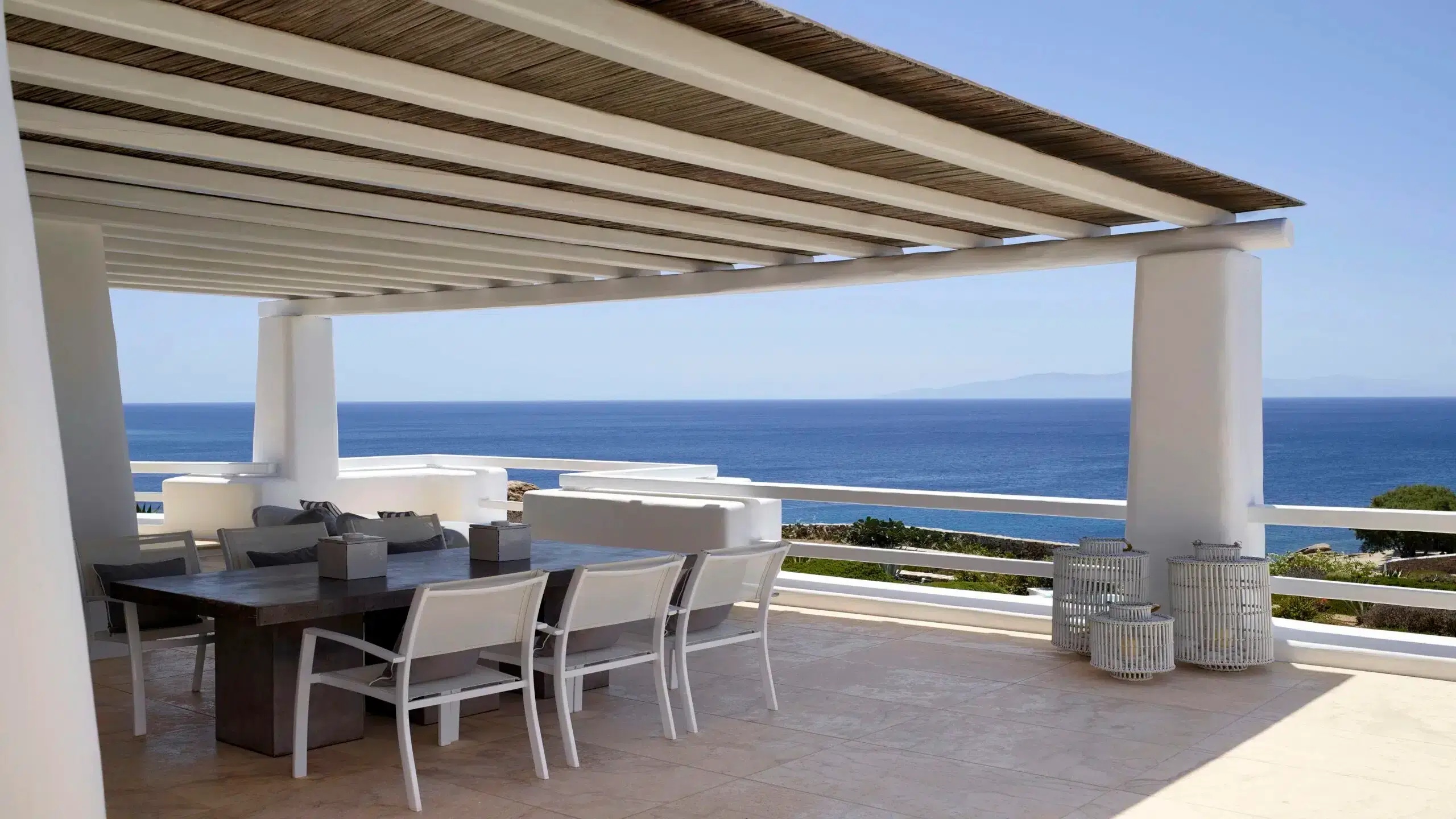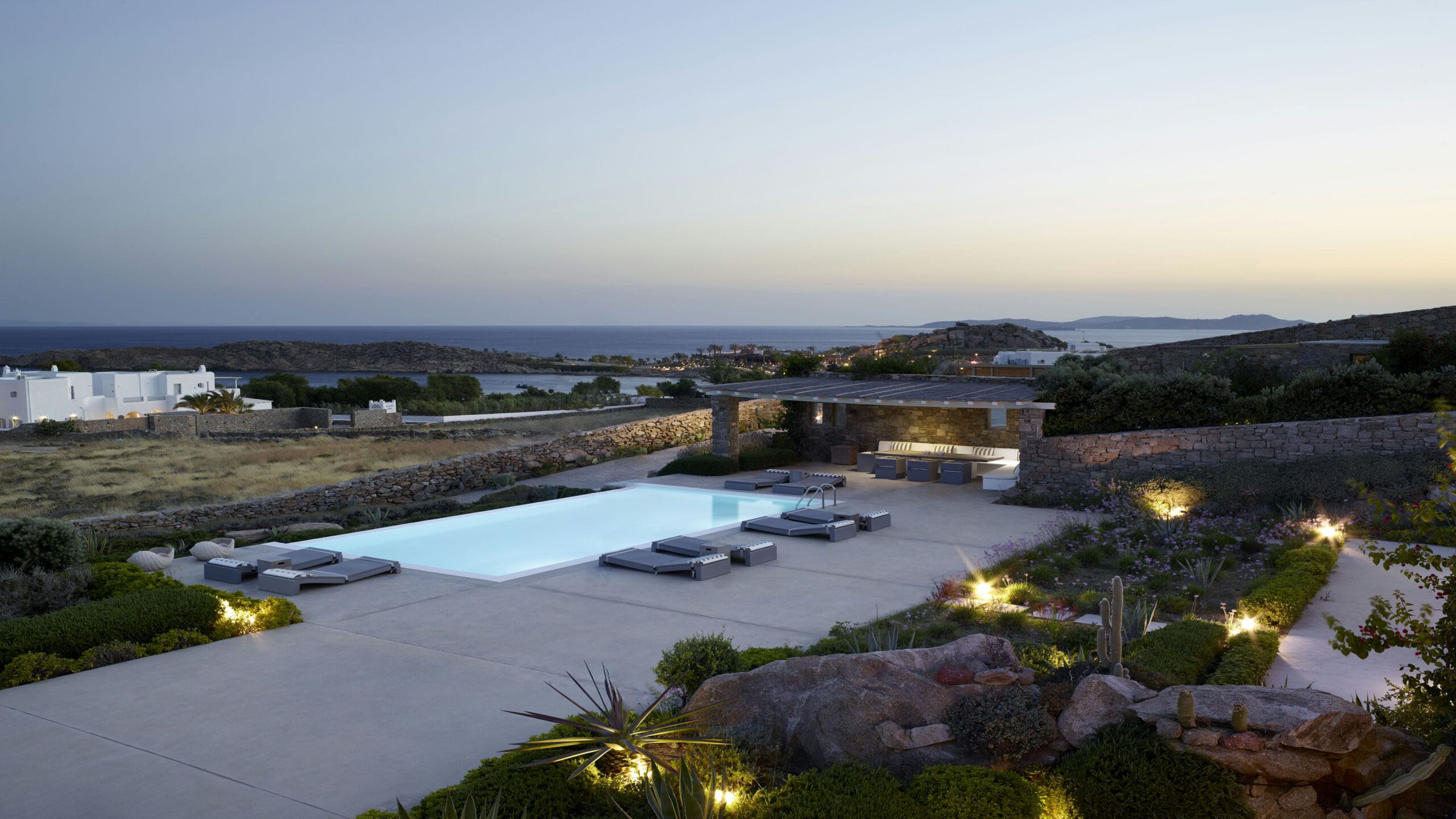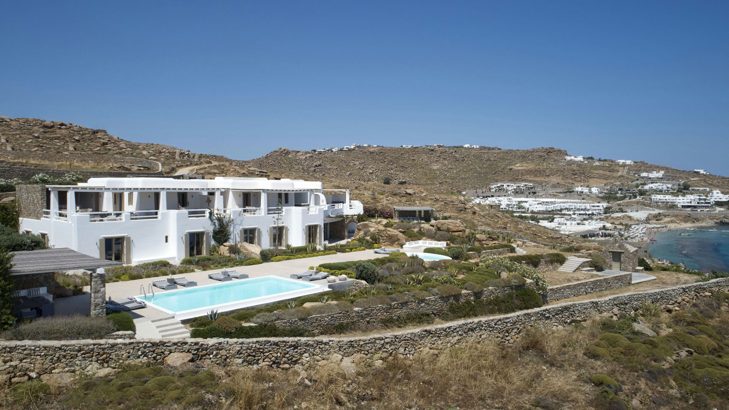 Luxury Villa 17.2 is a distinctive seaside retreat in southern Mykonos, offering panoramic views of the Aegean Sea and the nearby islands of Paros and Naxos. Set within a private bay, the property combines seclusion with easy access to the famous Paradise and Paraga beaches, known for their vibrant atmosphere.