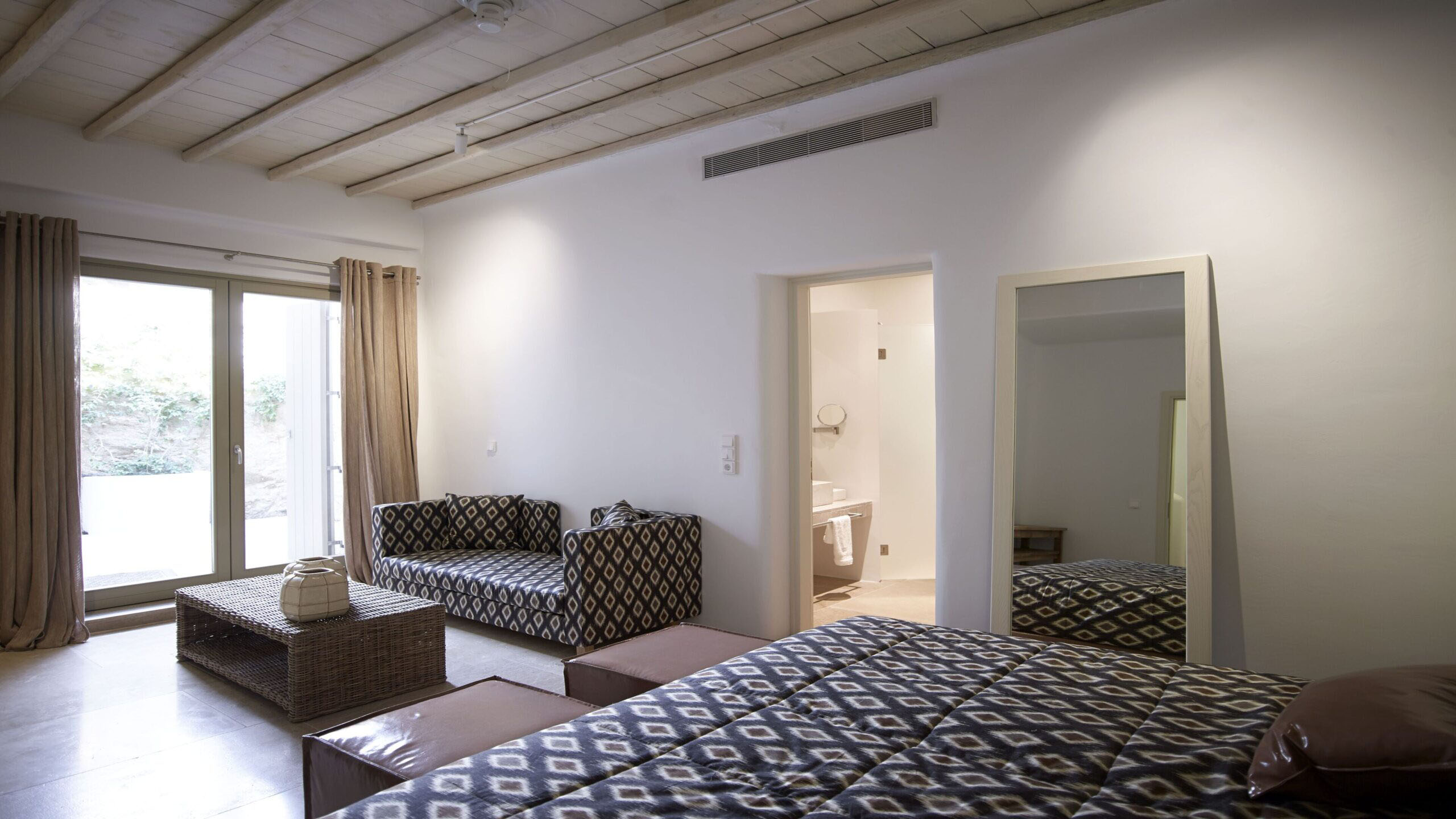 - Room 4: double bed, TV, DVD, [A/C], ceiling fans, safe box, mini-fridge, and ensuite bathroom with shower – access to the pool area via balcony doors