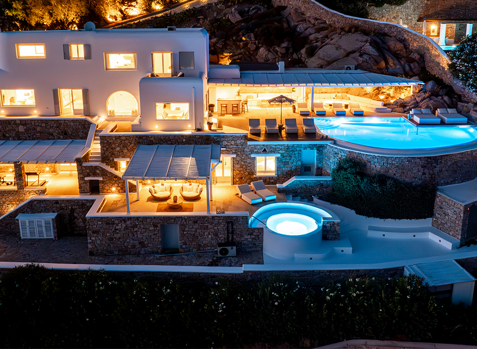 This superbly constructed property is located on a unique spot of Mykonos, Agios Lazaros, and less than 3 kilometers from town center and approximately 1 kilometer from the famous beach of Psarrou. Sheltered by almost all wind directions, the villa consists of spacious living areas and terraces with breathtaking view to the Cycladic islands and the Aegean Sea.