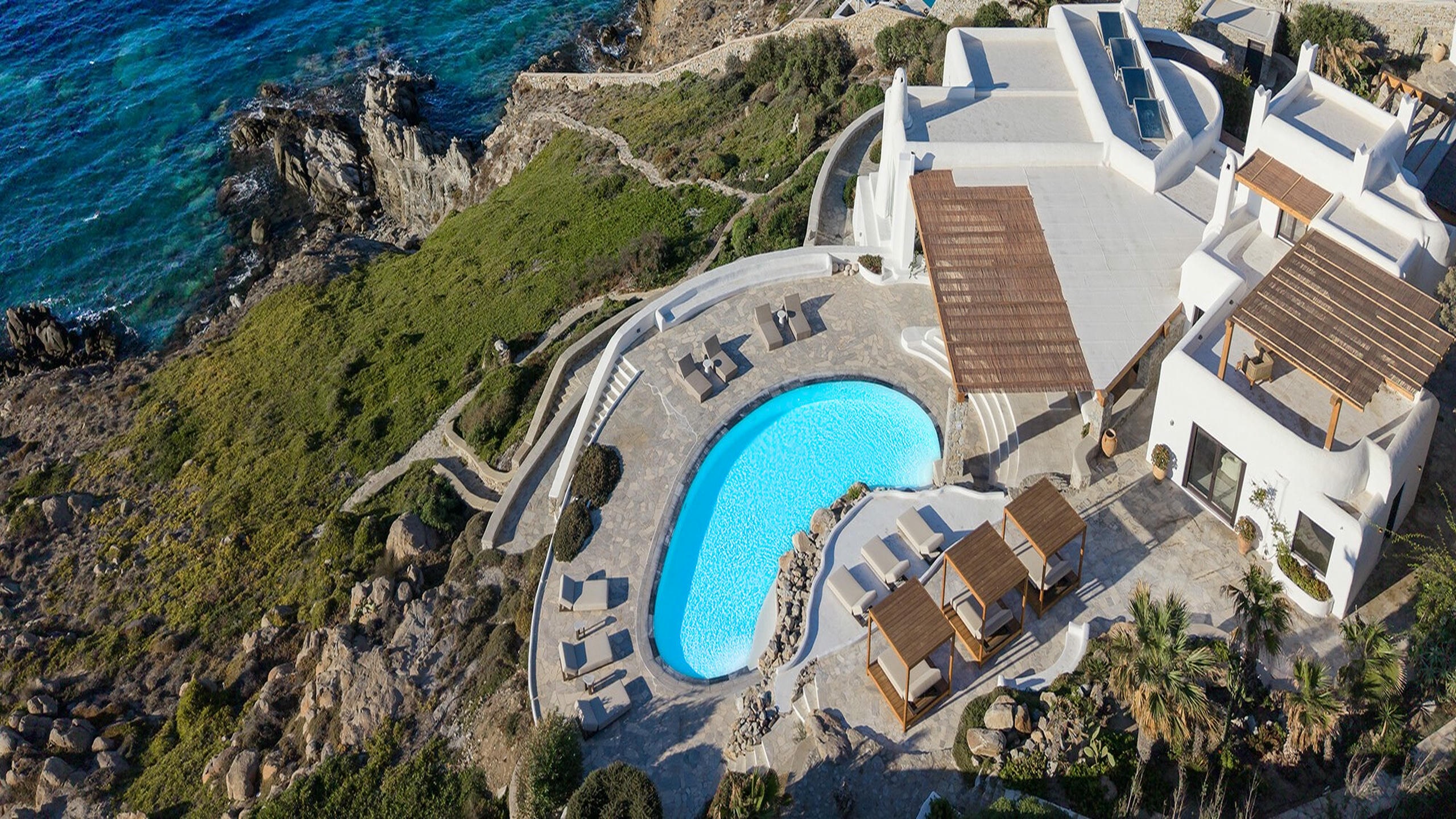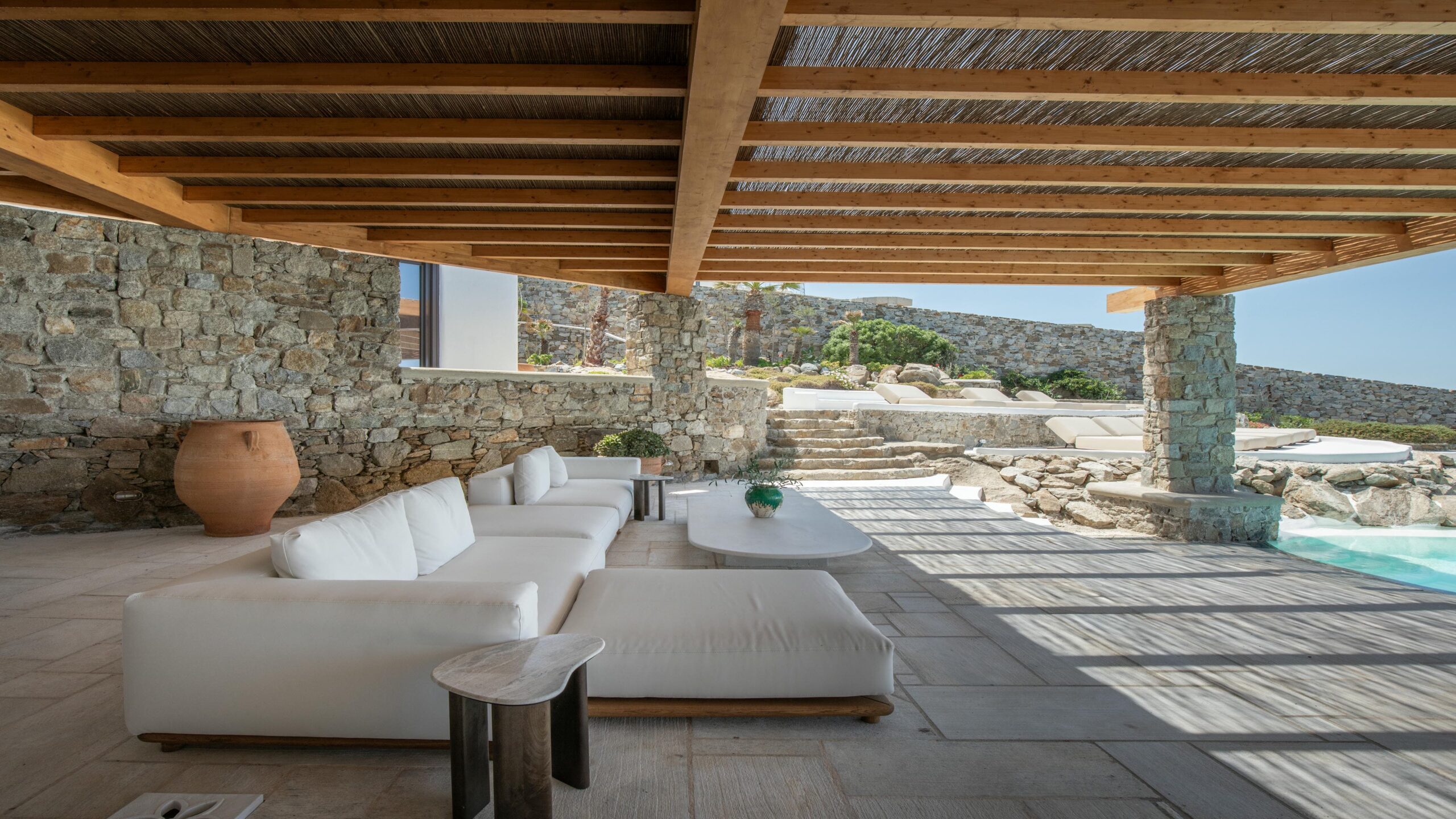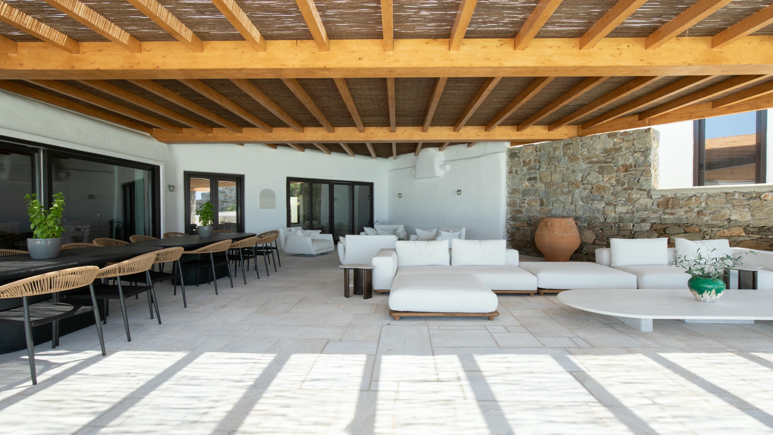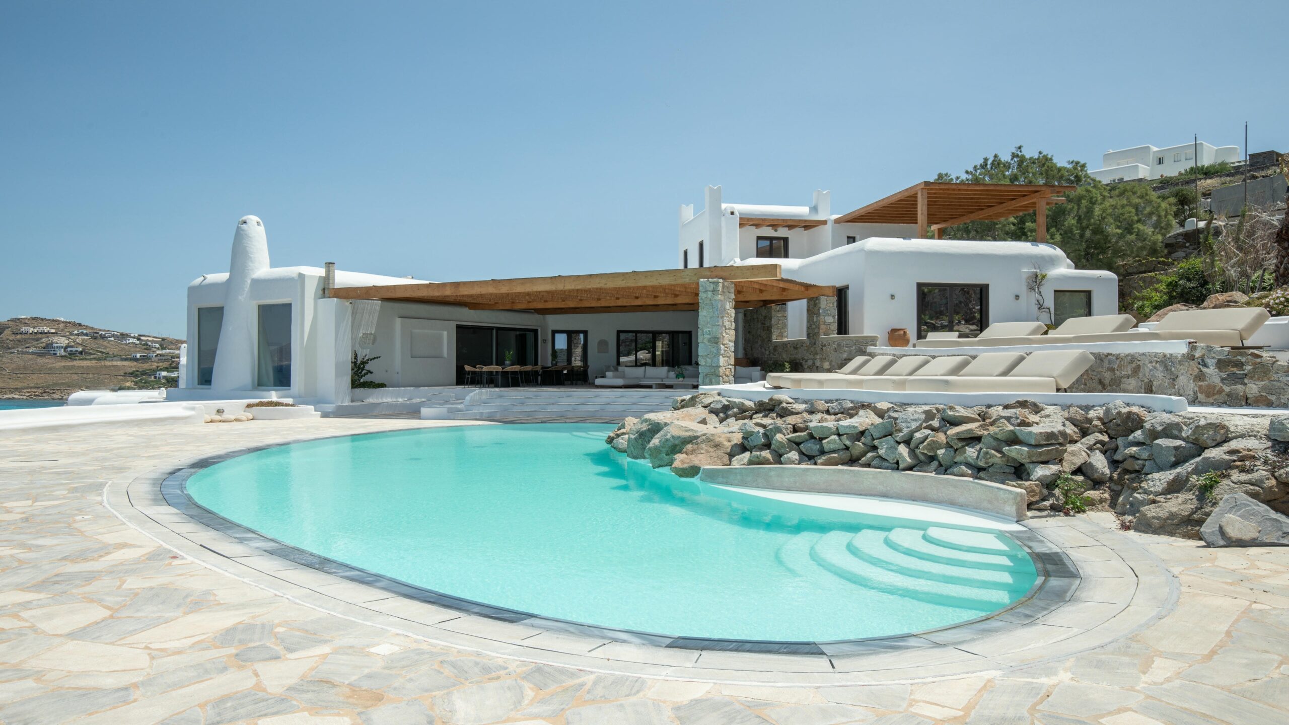 The villa spans four levels, including a master suite on the top floor with panoramic views, four ensuite bedrooms on the main level, two more on the lower level for added privacy, and a stylish independent guesthouse beneath the pool. The interiors feature a bright, open-plan living area centered around a statement fireplace, a modern kitchen with a generous island, and a tranquil massage room. Every room is equipped with A/C, satellite TV, and high-speed Wi-Fi. The expansive outdoor areas include a kidney-shaped heated pool, shaded lounging zones, and alfresco dining spaces—ideal for both sun-soaked afternoons and relaxing sunset evenings.