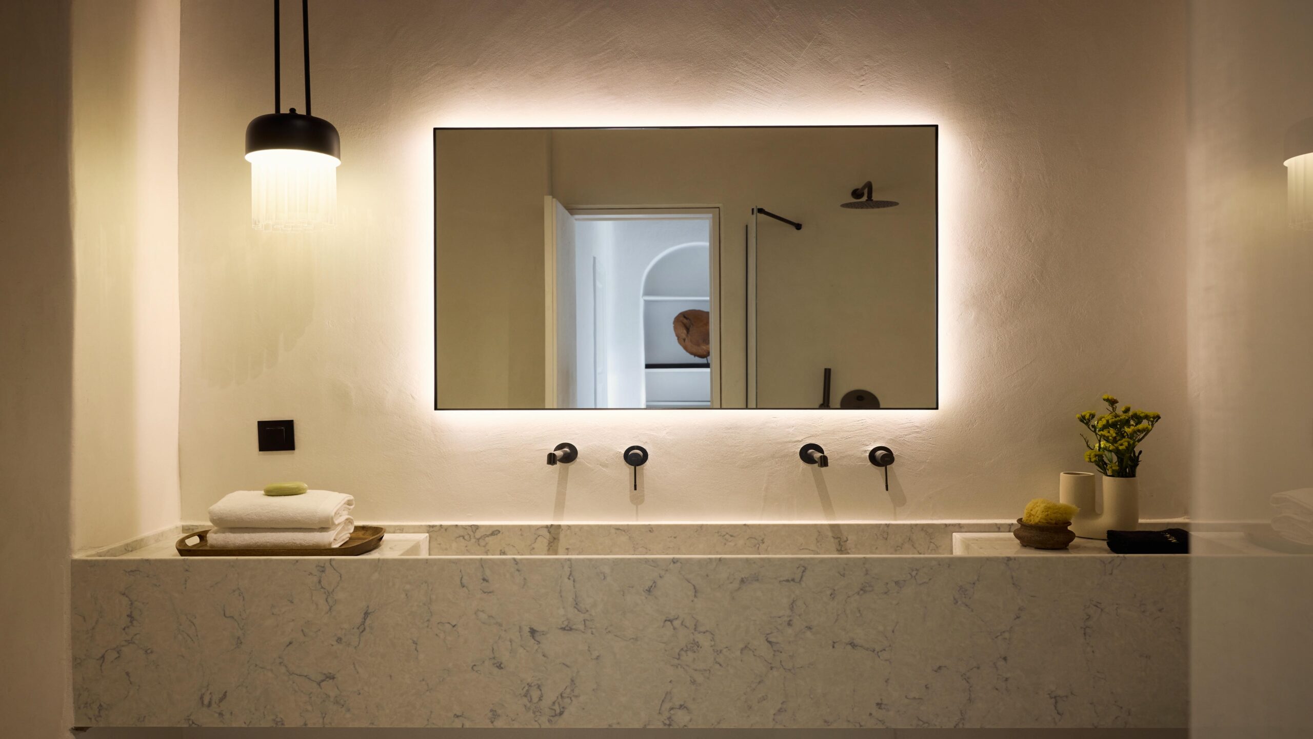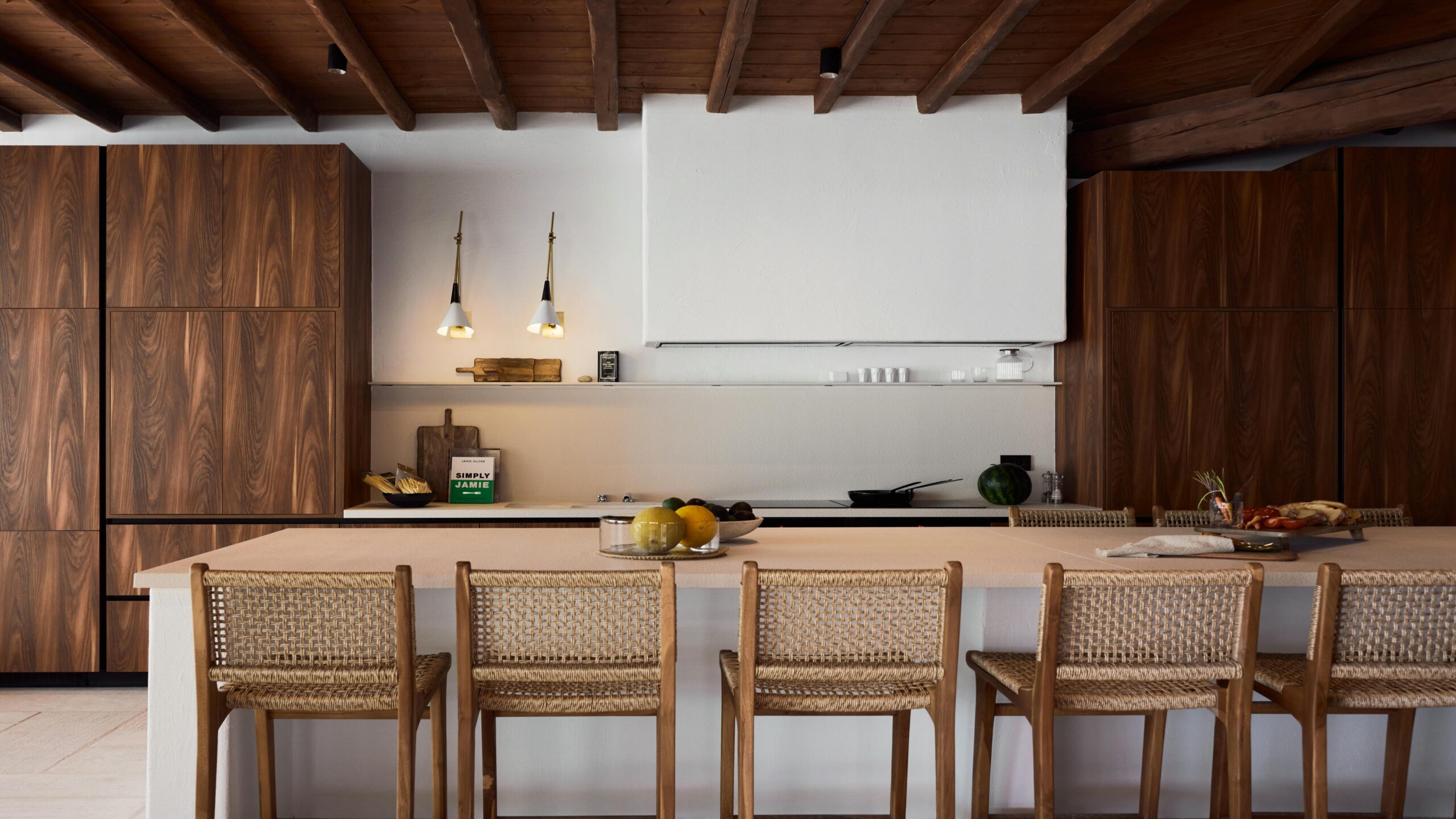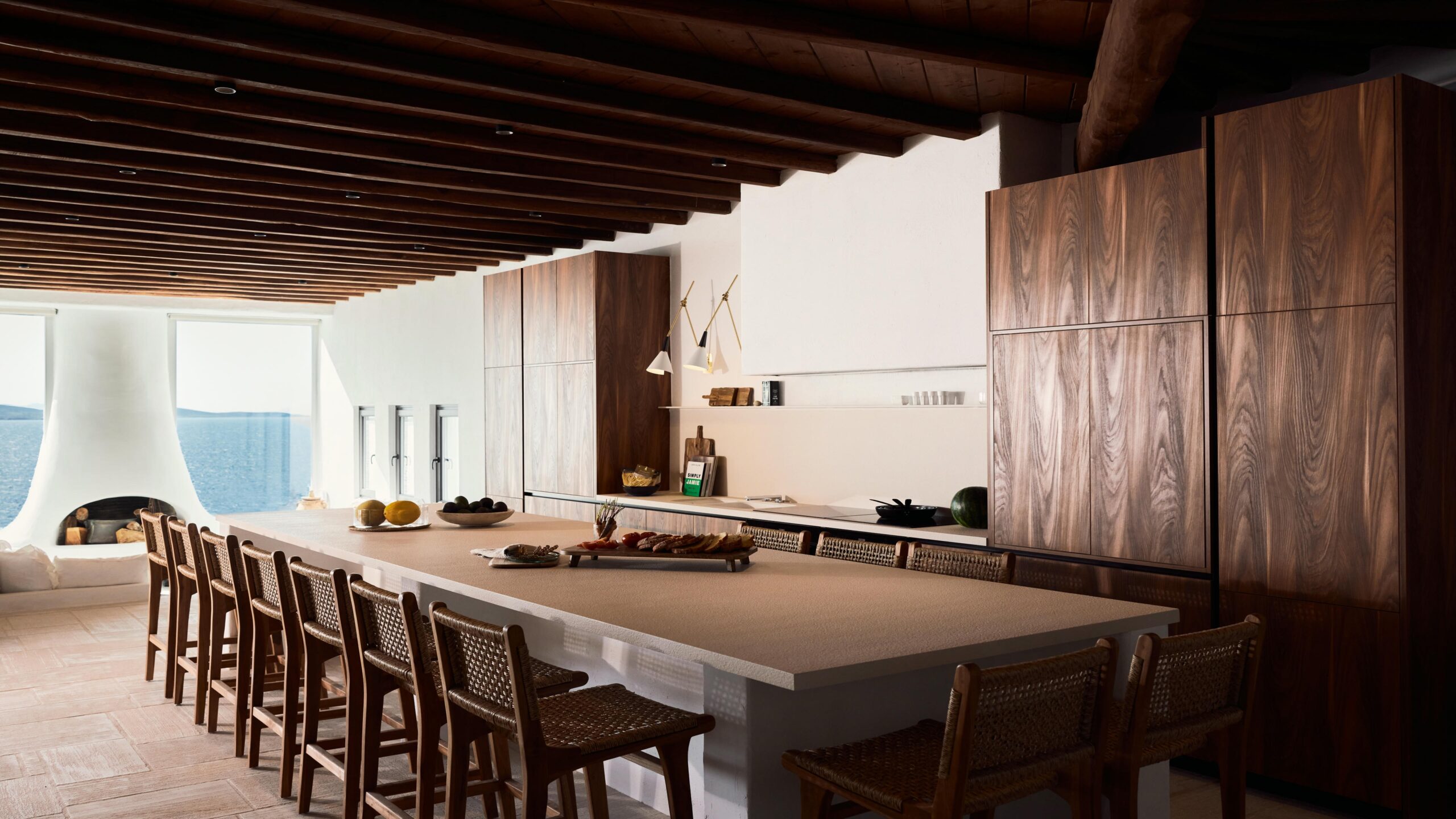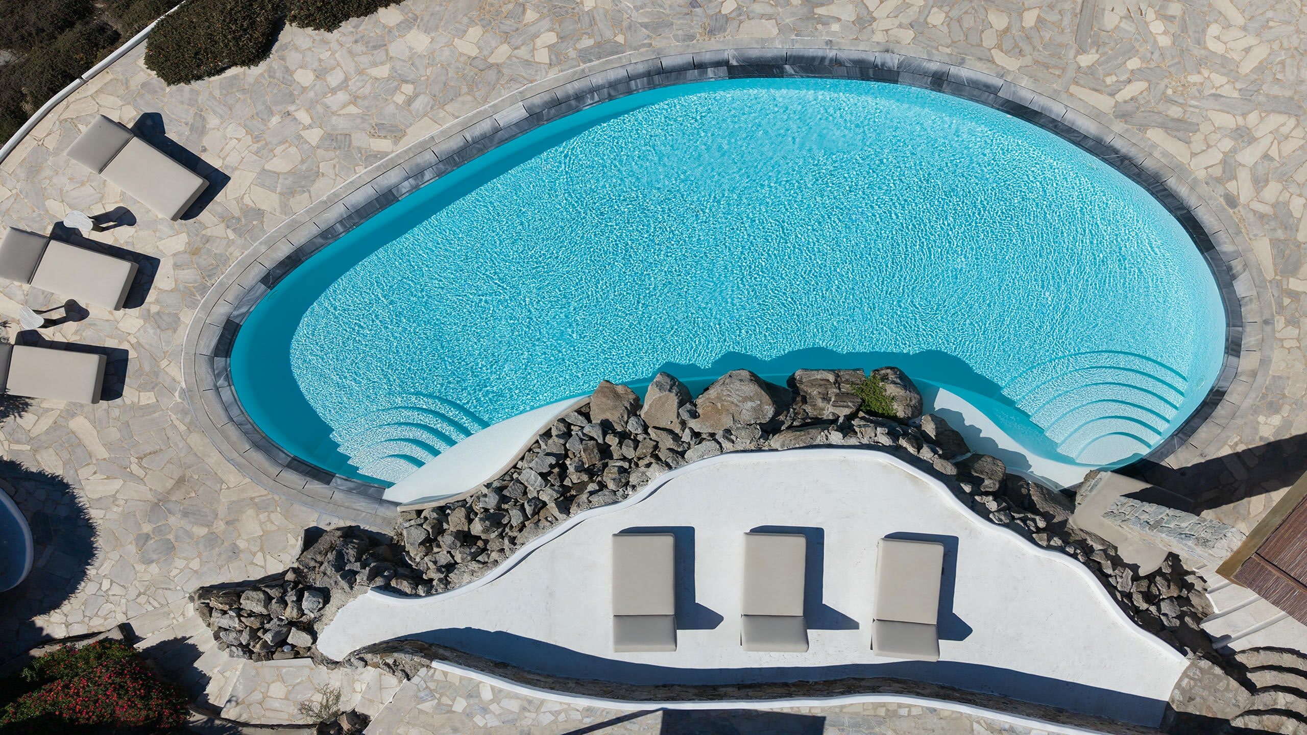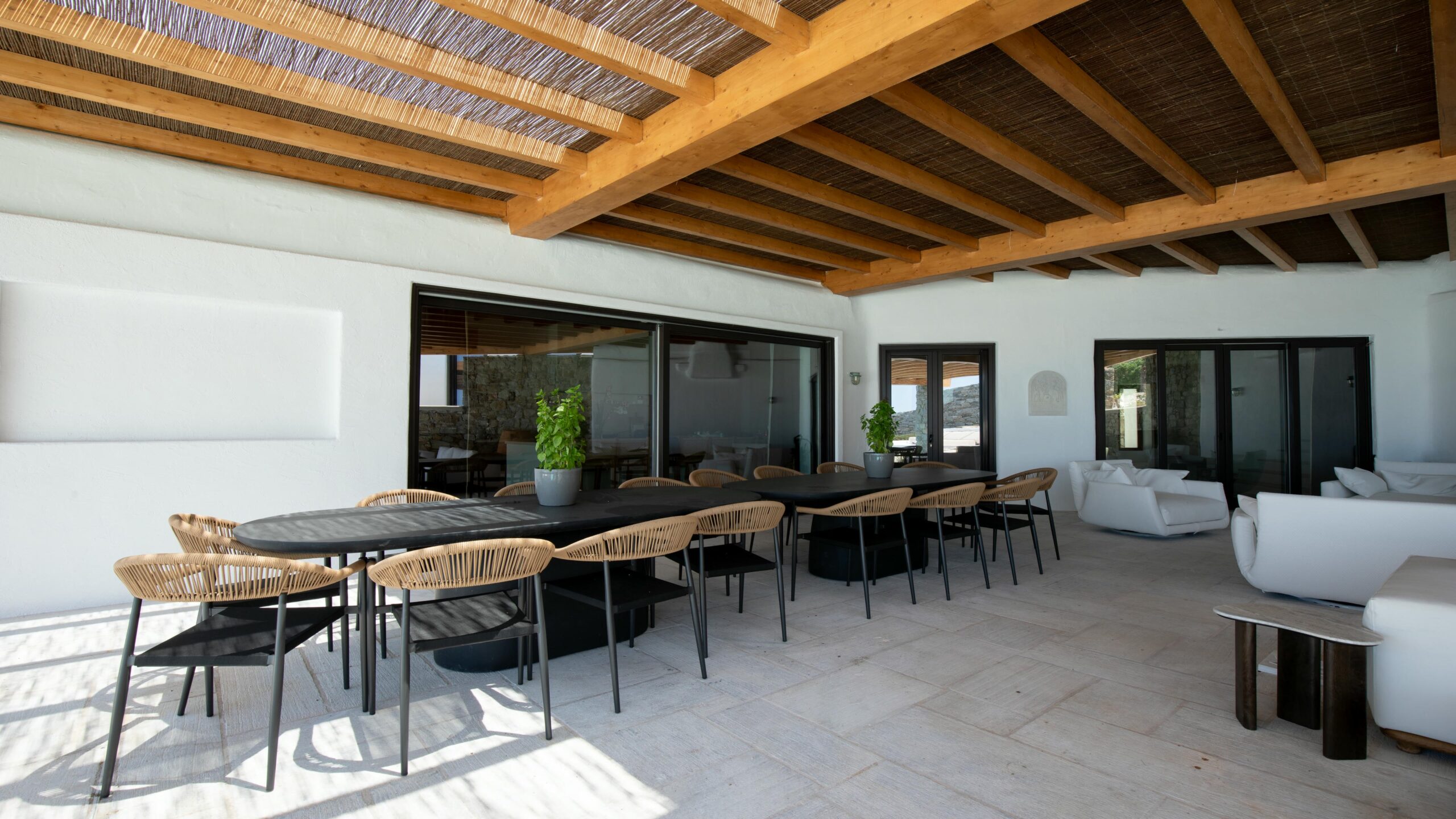 The villa spans four levels, including a master suite on the top floor with panoramic views, four ensuite bedrooms on the main level, two more on the lower level for added privacy, and a stylish independent guesthouse beneath the pool. The interiors feature a bright, open-plan living area centered around a statement fireplace, a modern kitchen with a generous island, and a tranquil massage room. Every room is equipped with A/C, satellite TV, and high-speed Wi-Fi. The expansive outdoor areas include a kidney-shaped heated pool, shaded lounging zones, and alfresco dining spaces—ideal for both sun-soaked afternoons and relaxing sunset evenings.