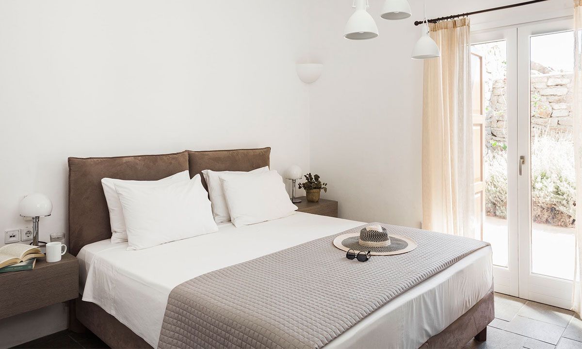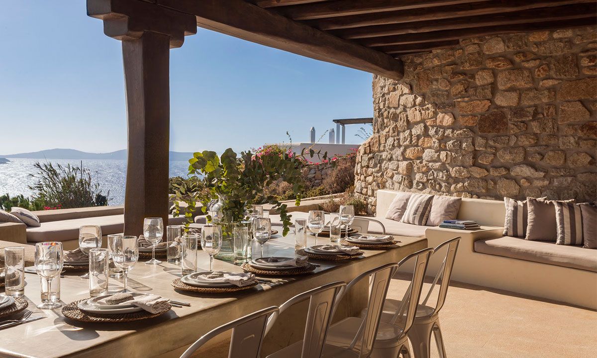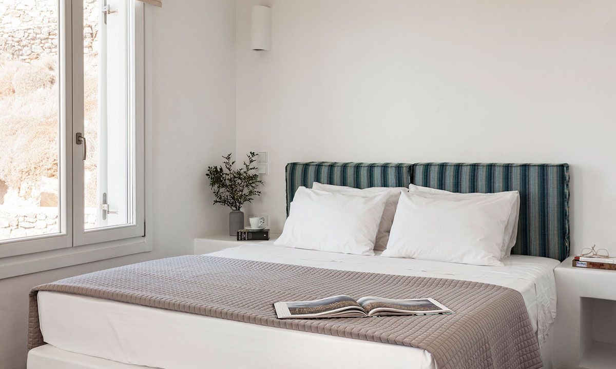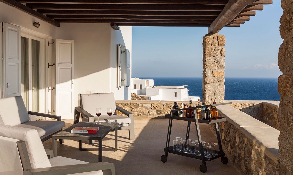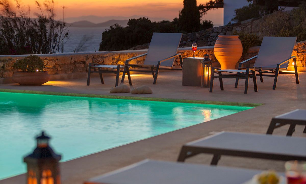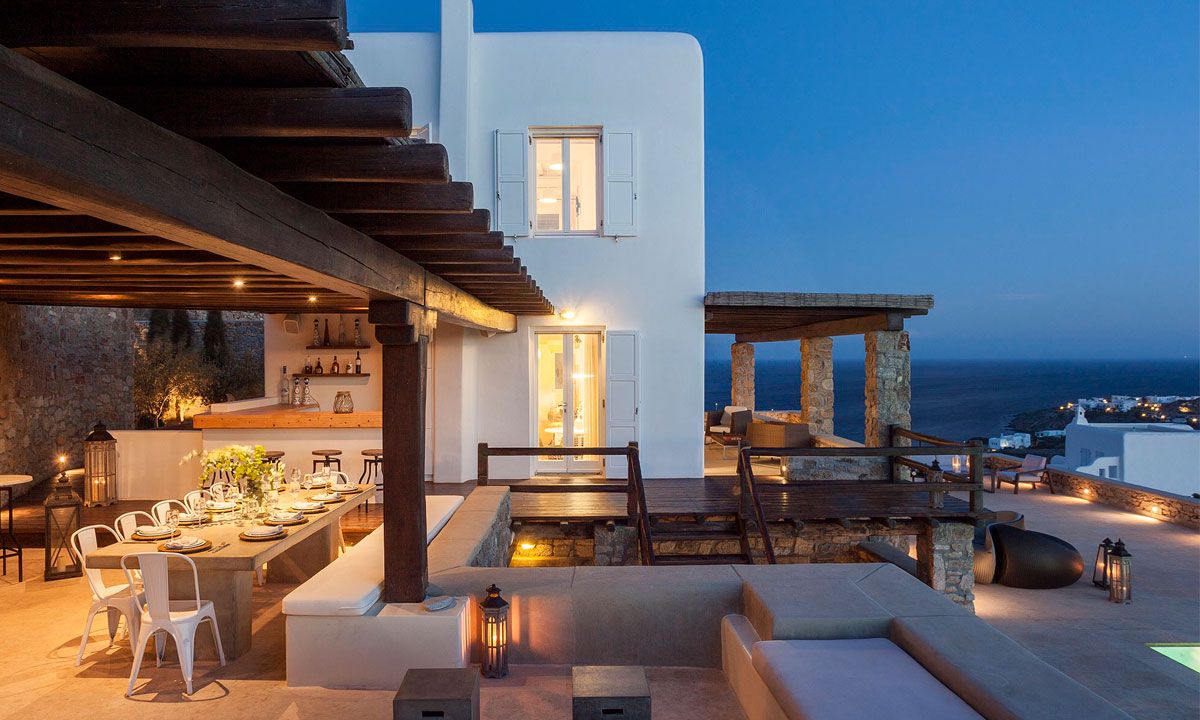 Outdoor spaces, designed by renowned Spanish architect Javier Barba, feature a large infinity-edge pool with pool bar, expansive sun decks, pergola-covered lounge and dining areas, and landscaped gardens. The villa is within walking distance of St. John beach, two minutes from Ornos beach, and 4 km from downtown Mykonos, the airport, and ports, providing easy access to shops, restaurants, museums, beaches, and sports facilities. Flexible rental options include the entire property or split into two independent houses, with the main house accommodating eight adults plus two children.