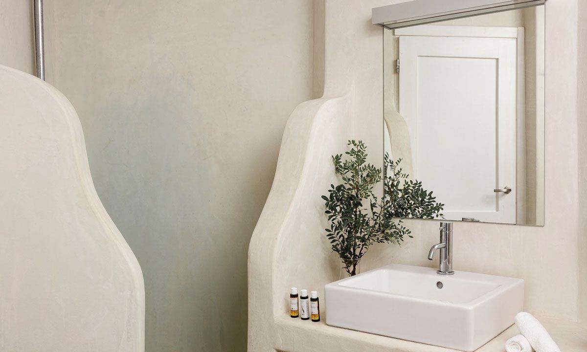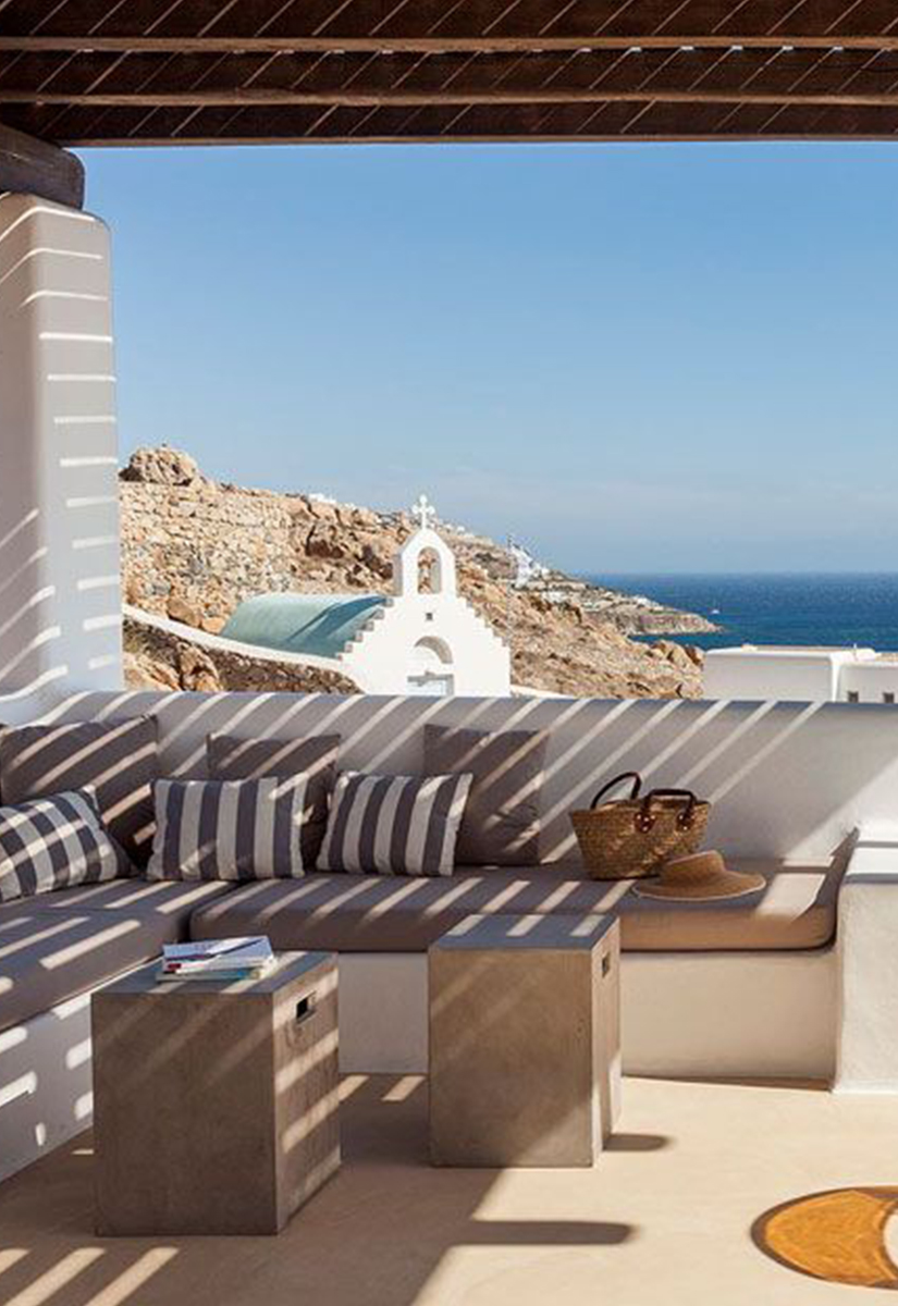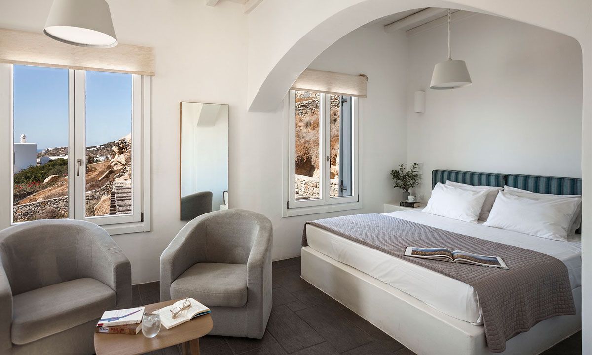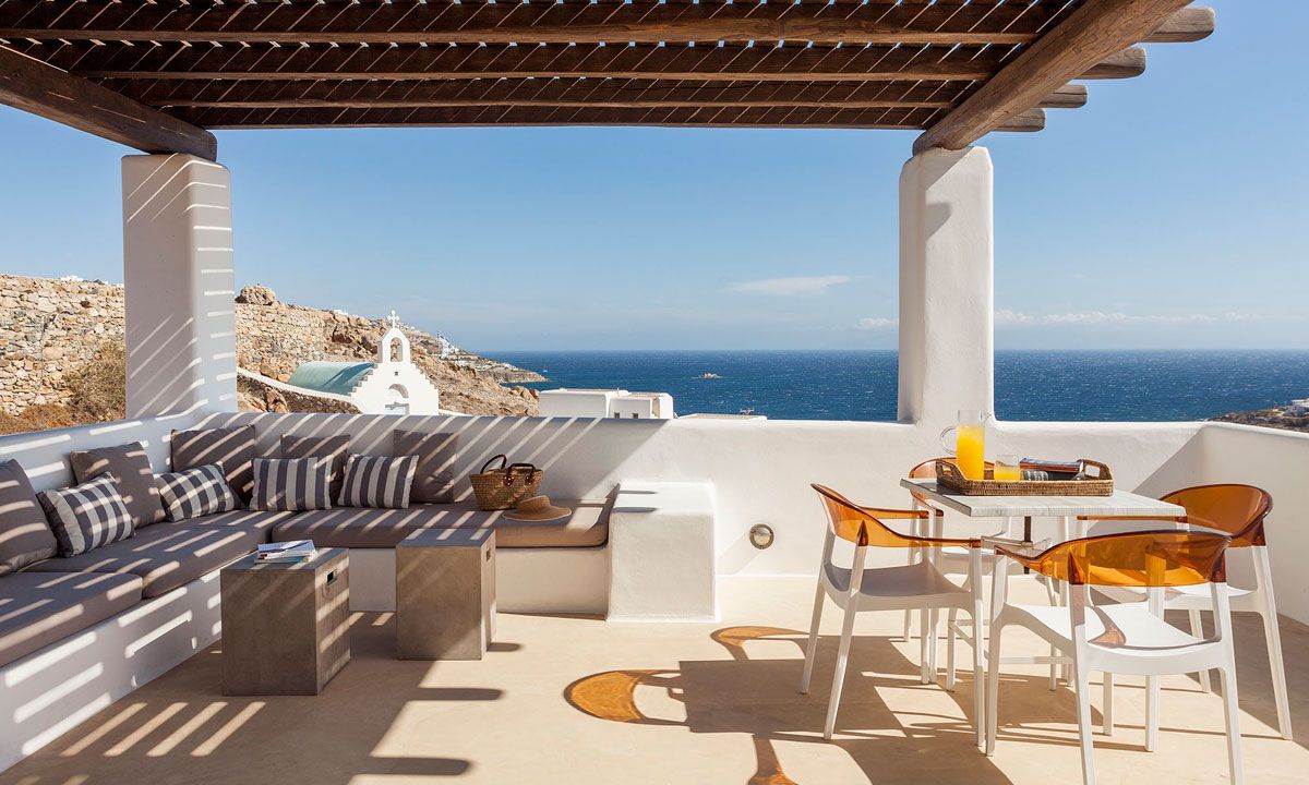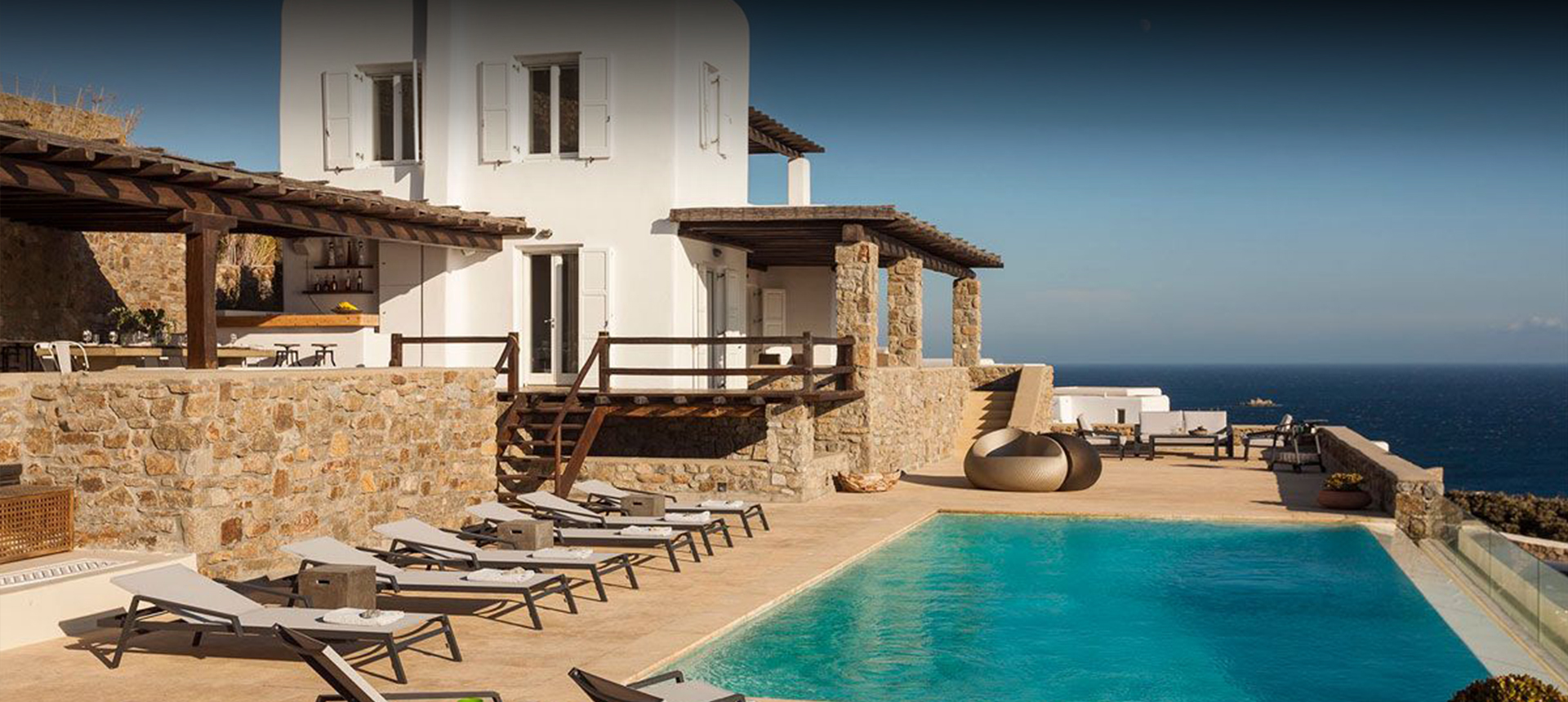 Outdoor spaces, designed by renowned Spanish architect Javier Barba, feature a large infinity-edge pool with pool bar, expansive sun decks, pergola-covered lounge and dining areas, and landscaped gardens. The villa is within walking distance of St. John beach, two minutes from Ornos beach, and 4 km from downtown Mykonos, the airport, and ports, providing easy access to shops, restaurants, museums, beaches, and sports facilities. Flexible rental options include the entire property or split into two independent houses, with the main house accommodating eight adults plus two children.