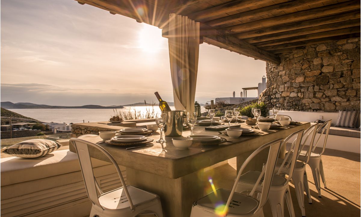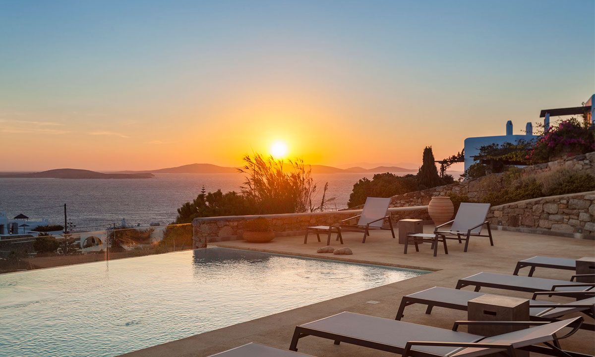 This magnificent residence is situated in the exclusive Agios Ioannis (Saint John) area of Mykonos, offering 1,100 m² of private grounds within a gated complex. The newly built villa faces south in a wind-sheltered location with breathtaking views over Delos and the Aegean Sea, delivering stunning sunset vistas. Spanning three levels, it features nine bedrooms, most with en-suite bathrooms, private patios, and sea views. The upper level hosts a luxurious master suite with panoramic views and a private terrace. The middle level presents an open-plan living and dining area with a fully equipped kitchen blending Cycladic design with modern technology. The lower level includes seven stylish bedrooms with en-suite bathrooms, four with garden patios overlooking the sea, plus two additional kitchens and an independent staff studio.